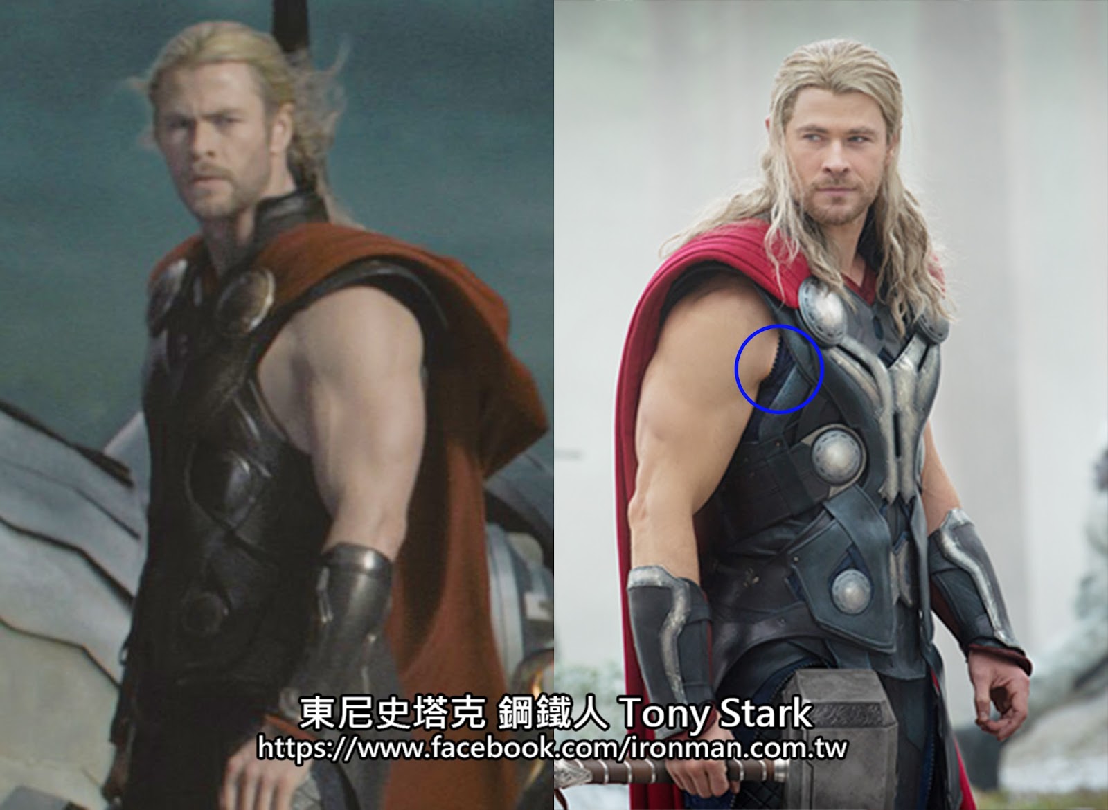 黃線:胸前黑色皮件的交疊順序部同,《雷神索爾2》的在圓盤與胸甲金屬件之間,《復仇者聯盟2》的則是在胸甲金屬件下方,與胸口皮衣合為一體。